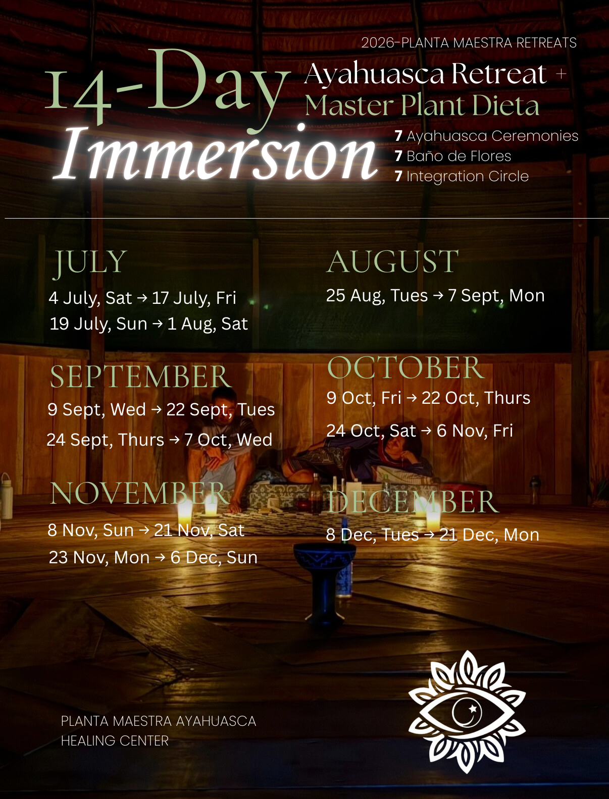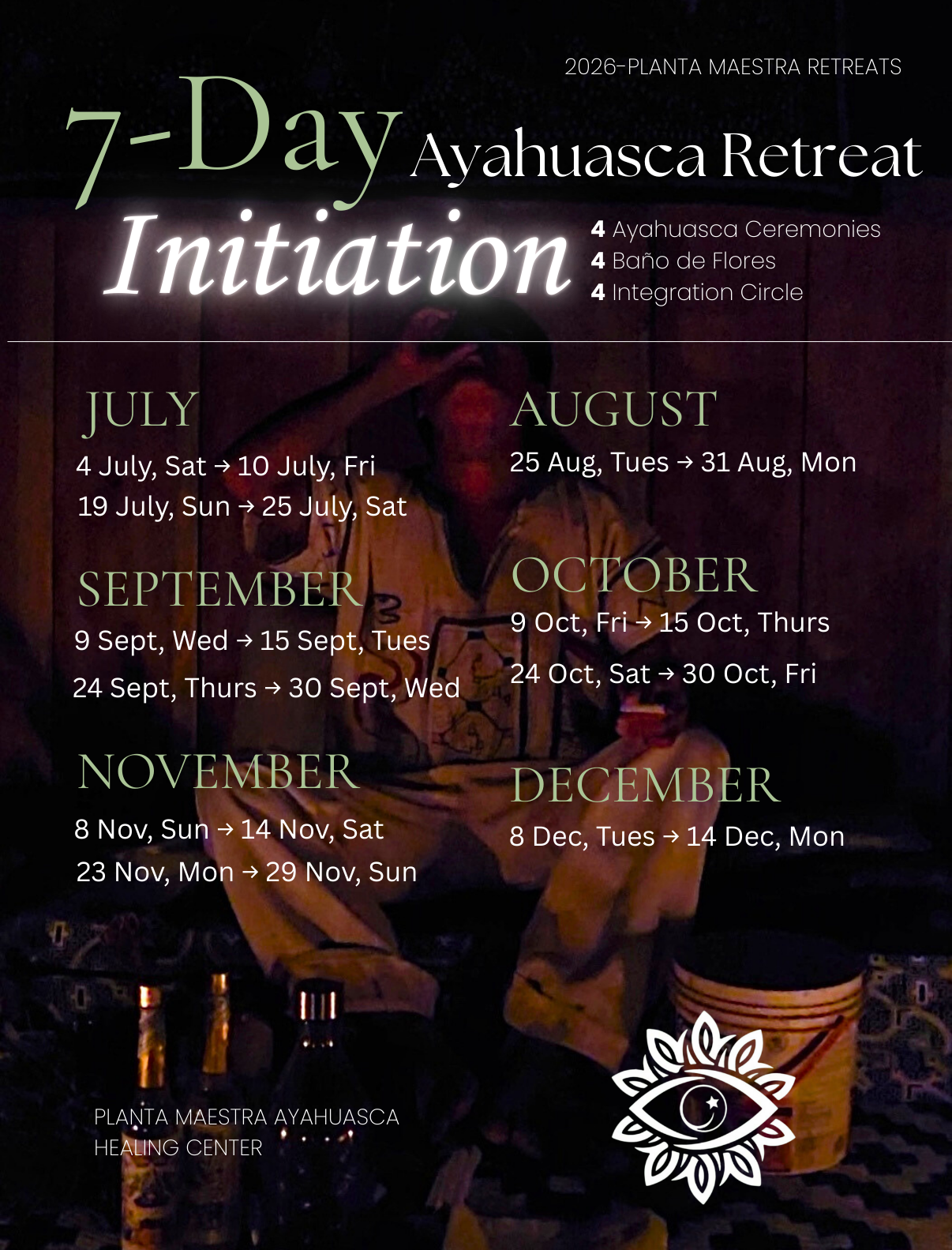 - Guided integration circles and rest days between ceremonies